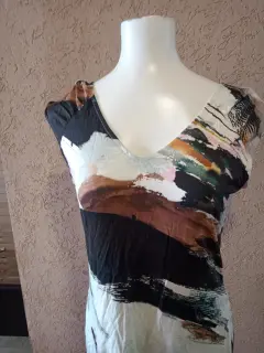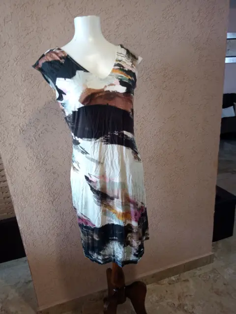 Excelente vestido fresco para la temporada de calor Composición 91% viscosa 6% elastano, forro 100% poliéster.Medidas hombros 45 cm, de axila a axila 46 cm, cintura 76 cm, cadera 92 cm, largo 93 cm