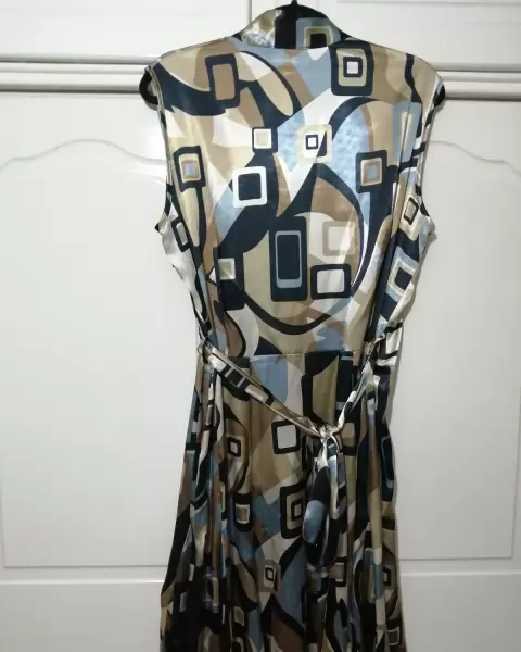 Lindo Vestido de poliester y Poco elástico de varios colores cruzado de la parte frontal y negro cierre oculto en la parte lateral se abrocha con moño en la parte trasera, en la parte de la falda tiene un pequeño jalón remendado y que no se percibe gracias a los decorados de la tela color negro dorado y beige