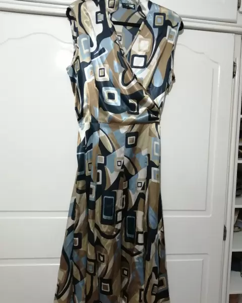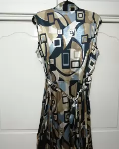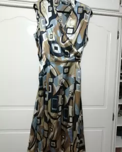 Vestido sin manga cruzado. Lindo Vestido de poliester y Poco elástico de varios colores cruzado de la parte frontal y negro cierre oculto en la parte lateral se abrocha con moño en la parte trasera, en la parte de la falda tiene un pequeño jalón remendado y que no se percibe gracias a los decorados de la tela color negro dorado y beige