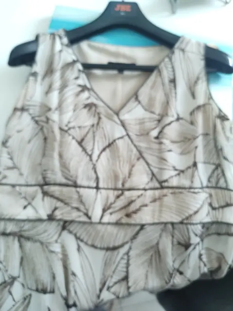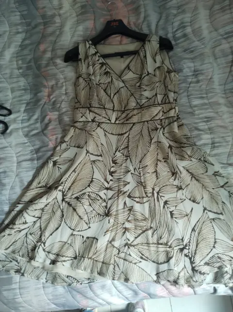 Vestido sin mangas con falda amplia en tonos cafes y cuello en V marca Julio talla 10. Se ve muy elegante y casual, queda perfecto para una fiesta de día y con un saco es una buena opción para usar en la oficina.