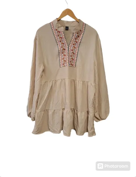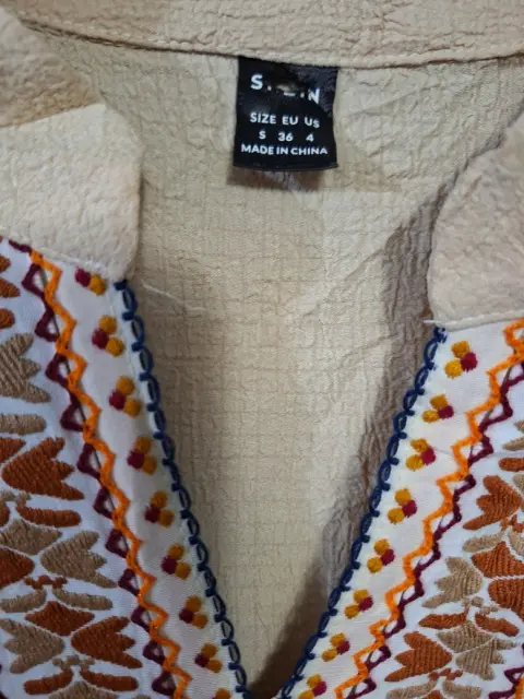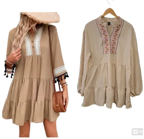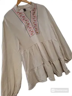 Vestido Smock con Bordado, manga larga, el bordado en tonos terracota, tela fresca pero no transparenta. Medidas de axila a axila 50cm Largo 80cm, es S, pero como queda muy holgado también puede quedar a M