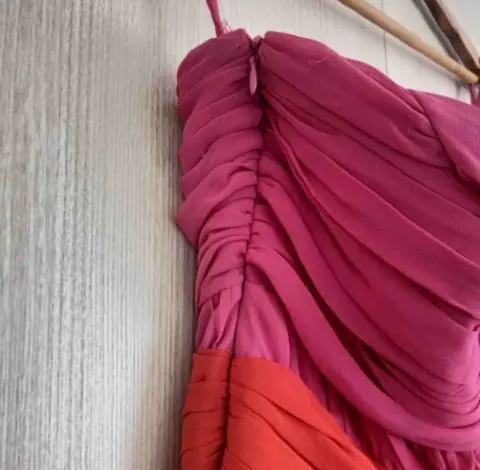 Vestido de fiesta, straple con tirantes, drapeado, cierre lateral, color fiusha y rojo.Talla entre M y L el busto da a una 36 B.