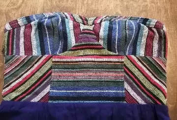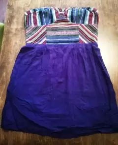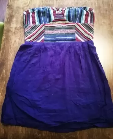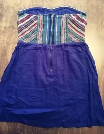 Vestido corto, strapless, sin detalles, muy poco uso, azul, torso de tela tejida.