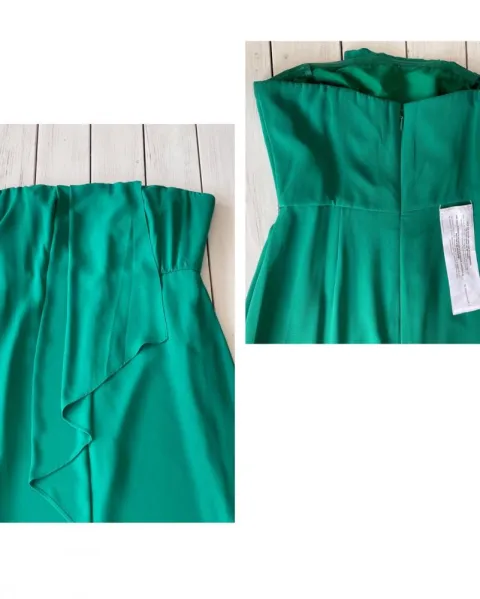 Vestido strapless BCBG. Talla: 2, ultra green (verde esmeralda) , strapless, corsé integrado, forro hasta arriba de la rodilla, tiene un olán al frente, abertura de la pierna. Se envía con el cubre de la marca. Medidas: 37.5 cm de axila, 33 cm abajo del corsé, 47 cm de cadera y 1.29 mt de largo.
