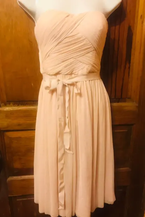 Vestido strapless corto de fiesta. Vestido strapless corto rosa palo, para fiesta. Con cinturón de tela. Tela estilo chifón o vaporosa pero es poliéster con nylon. Talla 2 o extra extra chica. Tiene solo una puesta pero como es delicado, se jalo un poco de una parte y aunque no es muy notorio me pareció importante mencionarlo, adjunto la imagen.