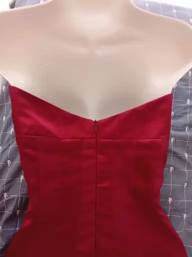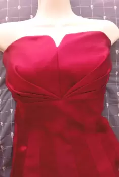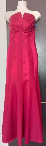 Hermoso vestido rojo cereza strapless de seda con escote muy favorecedor. Largo al tobillo. Detalles en la cintura para enmarcarlo. Muy elegante, te encantará.
