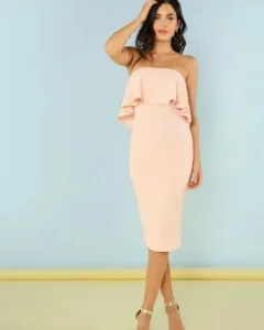 Vestido strapless rosa. Bonito vestido strapless entallado color rosa clarito tela poliéster y spandex es talla M medidas pecho 74-104cm cintura 68cm cadera 82 y largo 87 estira bastante yo mido 84 de pecho y no lo sentia tan firme quiza para tallas mas grande quede perfecto