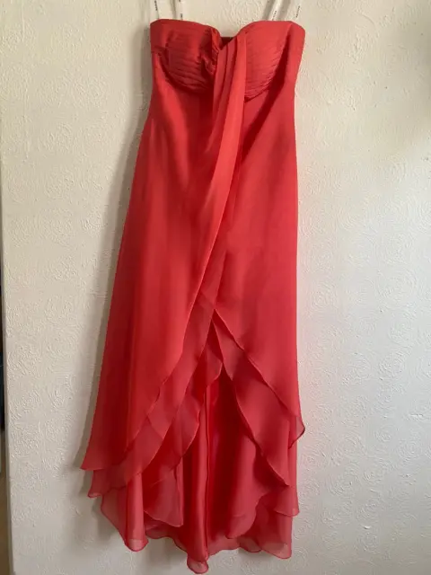 Vestido strapless salmón. Talla 5 (chica), color salmón, corto de enfrente, largo de atrás, con cierre en la espalda.