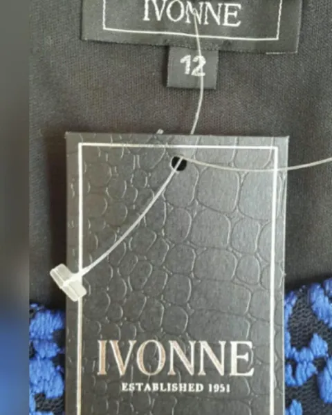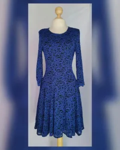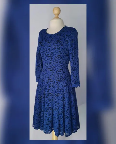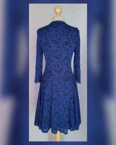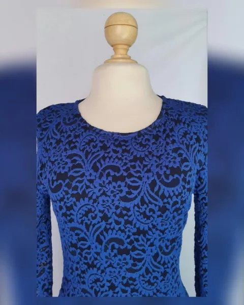 Vestido Stretch Midi corte Princesa. Vestido stretch encaje midi corte princesa bitono NEGRO ÉBANO/AZUL IMPERIAL, cuello redondo, sin sistema de cierre, manga 3/4 y forro interior. Talla 12. Dimensiones cms: 40 hombro, 46 axila, 39 cintura, 176 ruedo, 48 largo torax, 49 largo faldon, 97 largo total, 51 largo manga. 60% poliamida, 35% poliéster, 5% elastano. P/lavado en casa.