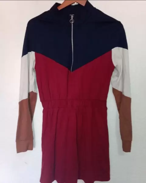 Vestido tipo sudadera con cierre, manga y cuello alto.Ajustado a la cintura