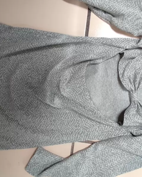 Vestido sueter gris brillosito talla 2 Lob. Vestido de tela de sueter, ideal para el otoño e invierno, con mallas o botas, tiene abertura en la espalda y un moño en la parte de atras, manga larga, es corto, talla 2, osea mediano, la composicion es 92% poliester y 8%algodon.
