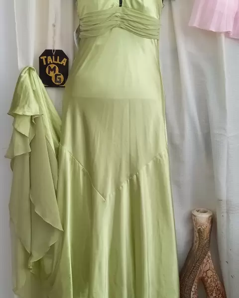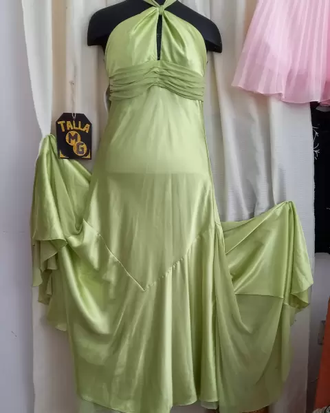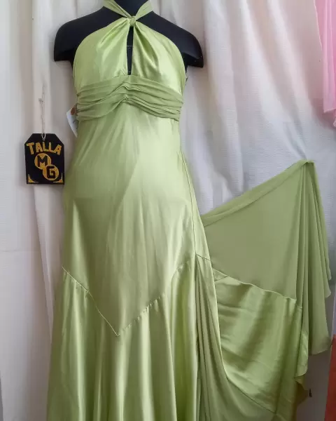 Vestido super Cola y halter verde. Hermoso, Elegante, super largo y muy bello,impecable, amarra al cuello,Talla L,XL seda strech, resalta la figura sin entallar , suave, bellisimo