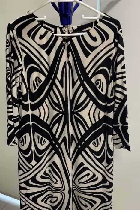 Vestido escote redondo con detalle en metal, crema y negro. Vestido 100% forrado de poliéster. 93cm largo, 44cm hombro y 43cm manga. Excelente estado de uso.