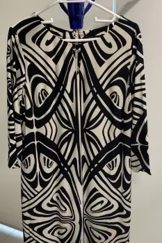 Vestido Tahari 14. Vestido escote redondo con detalle en metal, crema y negro. Vestido 100% forrado de poliéster. 93cm largo, 44cm hombro y 43cm manga. Excelente estado de uso.