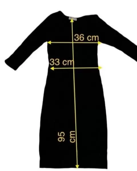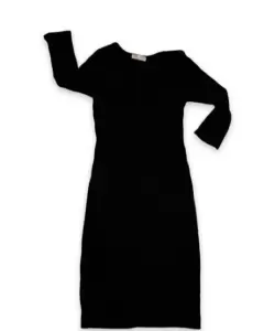 Cómodo vestido de tela estilo suéter (estira) de una sola pieza en color negro. Manga tres cuartos. Medidas en las imágenes .