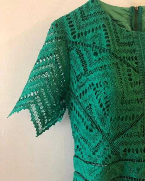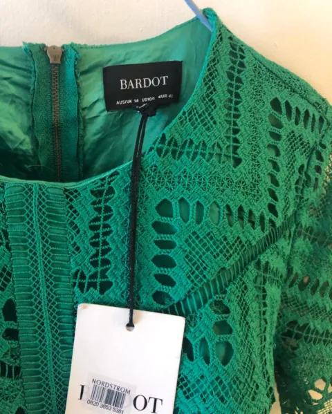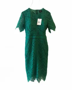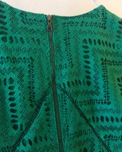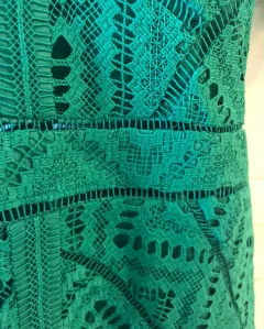 Vestido tejido verde Marca Bardot. Hermoso vestido de encaje de hilo. ElHilo no se atora o se rompe como los que son de elástico trae forro en top y falda brazos sin forro. No tiene detalles talla 14