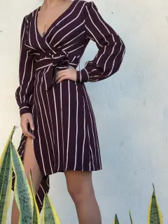 Vestido tinto a rayas. Vestido asimétrico, de manga larga, escote cruzado en V, tiene cierre y cinturón de tela