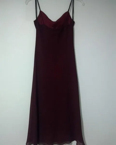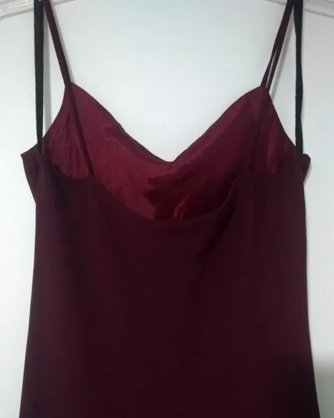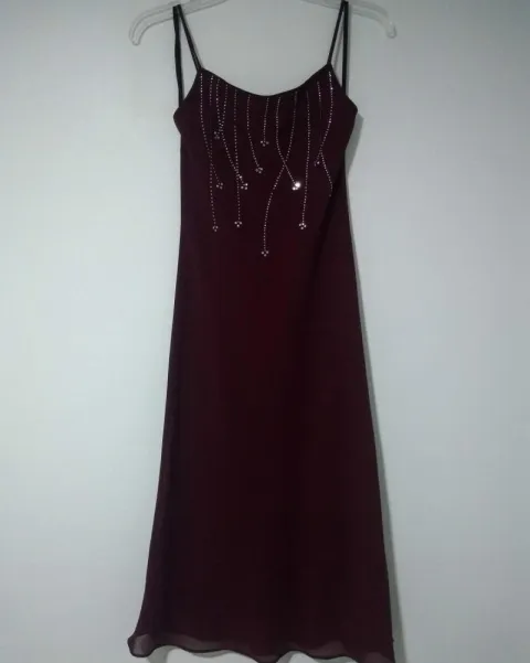 Vestido Tinto con Pedrería con tirantes delgados, no trae cierre ni botones, es muy angosto talla petit o XS, para una jovencita o alguien de talla muy pequeña, mide ancho Axila=43cm, ancho Cintura=42cm, ancho Cadera=49cm, Largo=116cm, Te regalo $100 con mi código de descuento si es tu primera compra iuNisj3oSQ