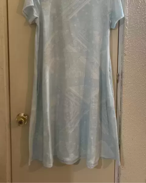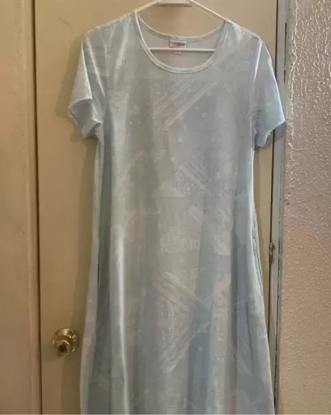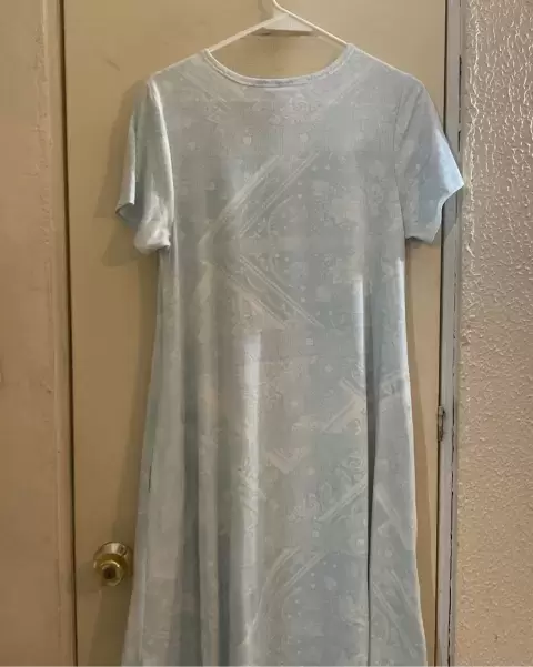 Vestido tipo camiseta, blanco con azul cielo, bolsos a los costados, llega a la rodilla, va muy bien con tenis, talla S también queda a M
