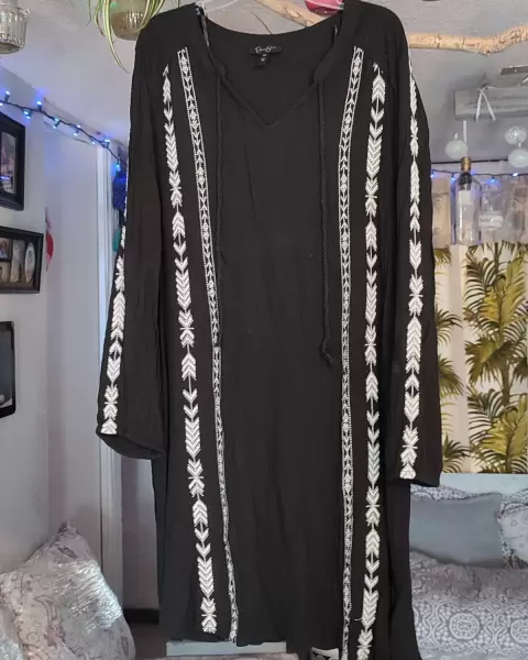 Vestido tipo guayabera xl. Bonito y supercomodo , fresco vestido tipo guayabera color negro con bordados al frente yen las mangas color blanco manga 3/4 largo a la rodilla puede usar con un cinturón o cintilla para acentuar la cintura