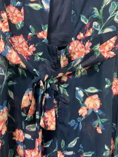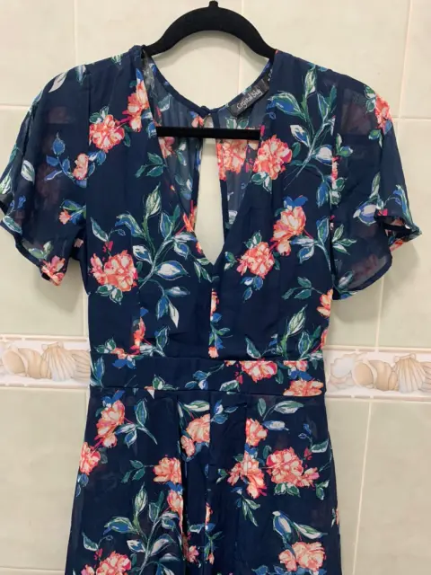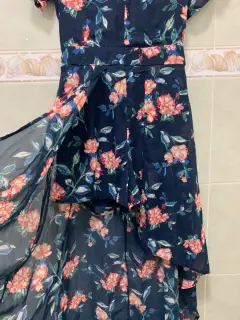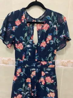Vestido tipo jumsuit. Jumsuit con cola larga, manga corta, escote en V, abierto de la espalda. Tela ligera.Medidas/ espalda: 35 cm, busto: 42 cm, cintura: 36 cm, largo total: 1.50 m.