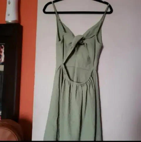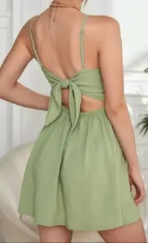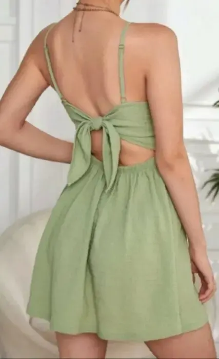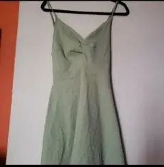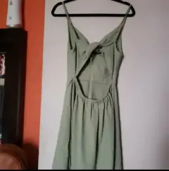 Vestido tirante con nudo. Vestido corto color pistache, escote en espalda, se cierra por la parte de atras, largo arriba de la rodilla.