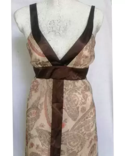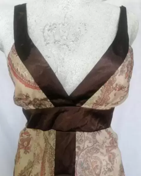 Vestido sin manga,cuello v,tela gasa estampada en color camel,con vistas lisas de satin color cafe. Talla L.