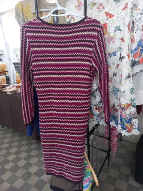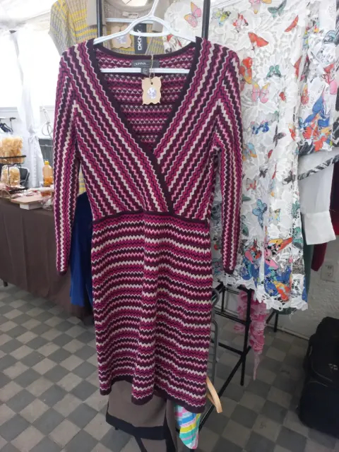 Vestido tonos de rosa de telar. Tiene varios tonos de rosa y beige para cobtrastar es cuello v y esta hecho en telar