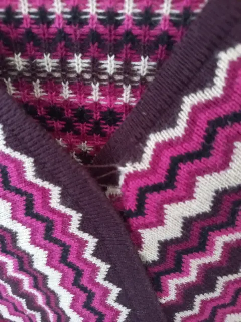 Tiene varios tonos de rosa y beige para cobtrastar es cuello v y esta hecho en telar