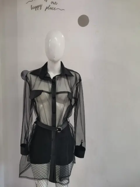 Vestido transparencia. Vestido estilo camisón de tela transparente con detalles tipo vinipiel que simulan bolsillos,en los puños, botones y cinturón
