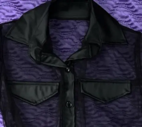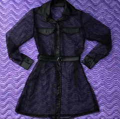 Vestido estilo camisón de tela transparente con detalles tipo vinipiel que simulan bolsillos,en los puños, botones y cinturón