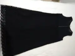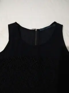 Vestido negro recto con transparencia en la parte de arriba y textura tipo encaje en la parte de abajo, talla xs, 91 cm de largo desde los hombros hasta abajo, hombro a hombro 29 cm