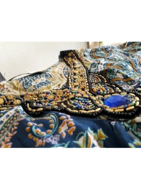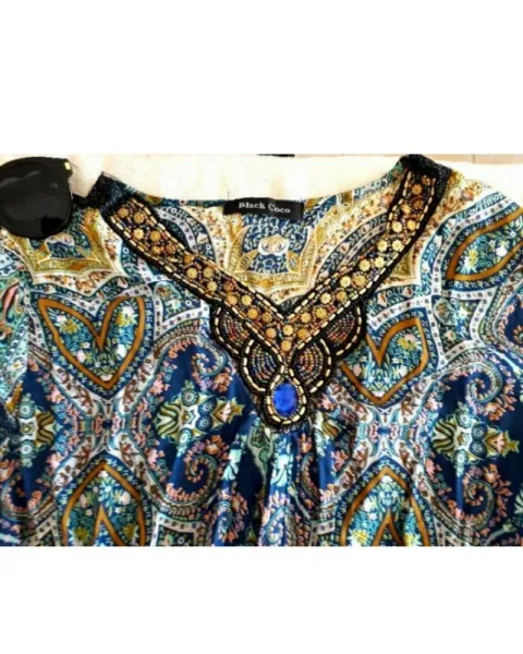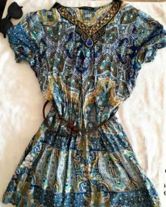 Hermosisimo vestido estilo tribal con hermosos detales en el cuello de pedreria. Perfecto para estos dias de calor. No incluye cinto. Medidas:55 cm cintura, Largo 88 cm, Hombro a hombro 42 cm, Axila a axila 53 cm