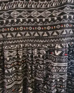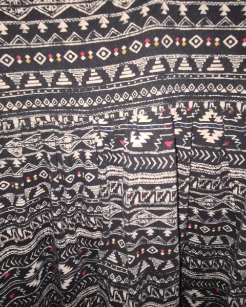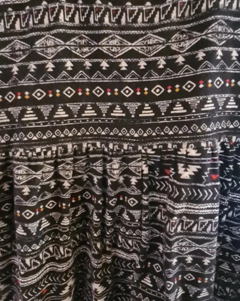 Descripción:Vestido negro sin mangas, 100% de lycra, en la parte de arriba de red negra y los adornos son tipo tribal. Linda abertura de óvalo en la espalda. Cintura 80 cm