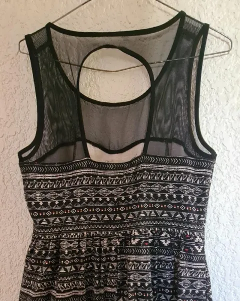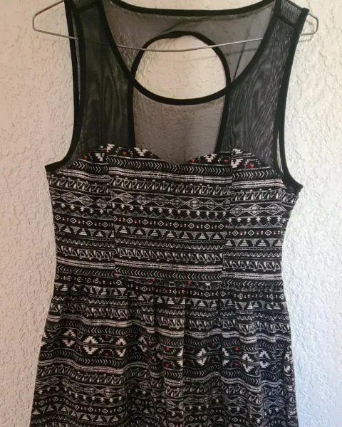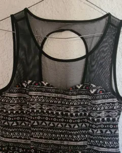Vestido tribal negro. Descripción:Vestido negro sin mangas, 100% de lycra, en la parte de arriba de red negra y los adornos son tipo tribal. Linda abertura de óvalo en la espalda. Cintura 80 cm
