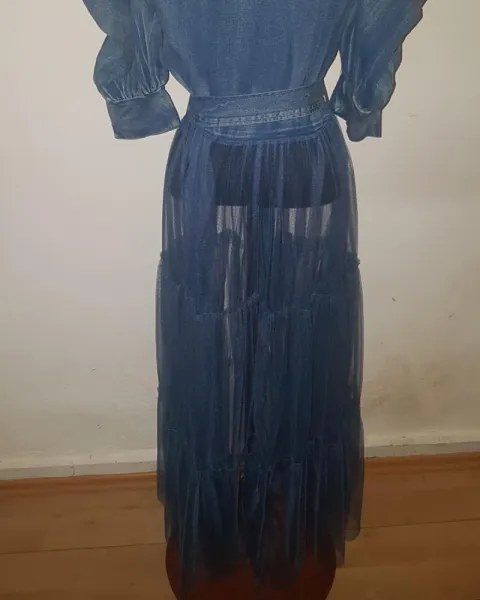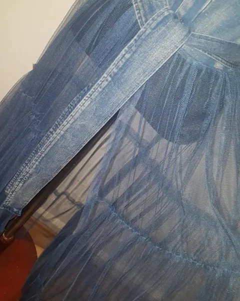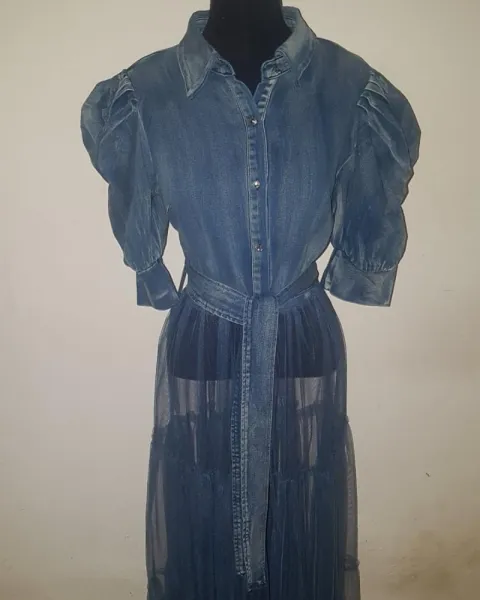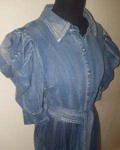 Vestido tul mezclilla. Hermoso vestido de mezclilla con hombreras, parte de abajo tul, con cinta para ajustar la cintura.
