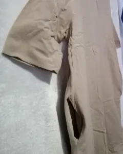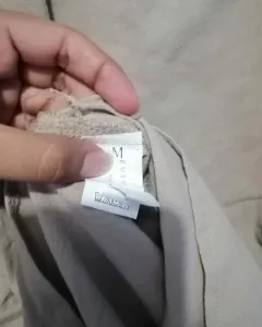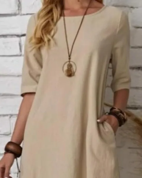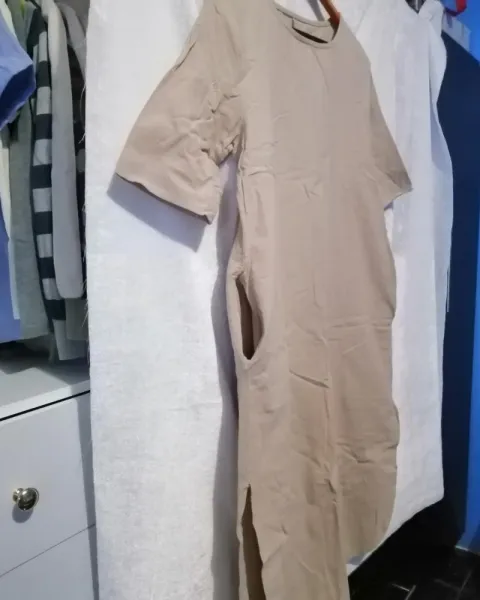 Vestido beige, tela tipo manta, tiene bolsas laterales y eberturas en los lados, yo lo use para etapa de embarazo.