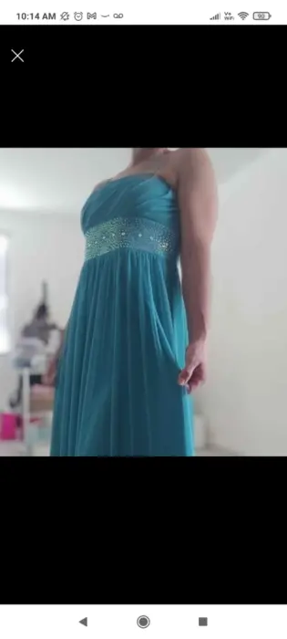 Vestido turquesa. Vestido de fiesta, gasa con forro, aplicaciones al frente, escote recto drapeado. Hermoso vestido de dia
