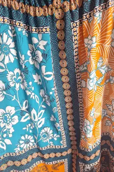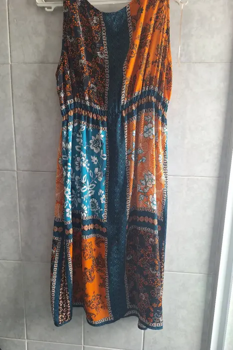 Es un vestido con tel muy suave tiene resorte en la parte de la cintura es 3/4 sin mangas es muy fresco