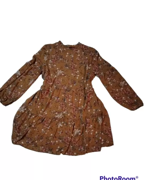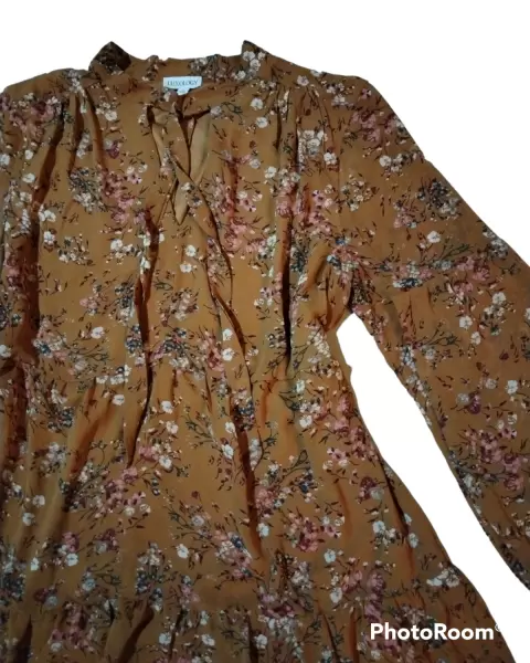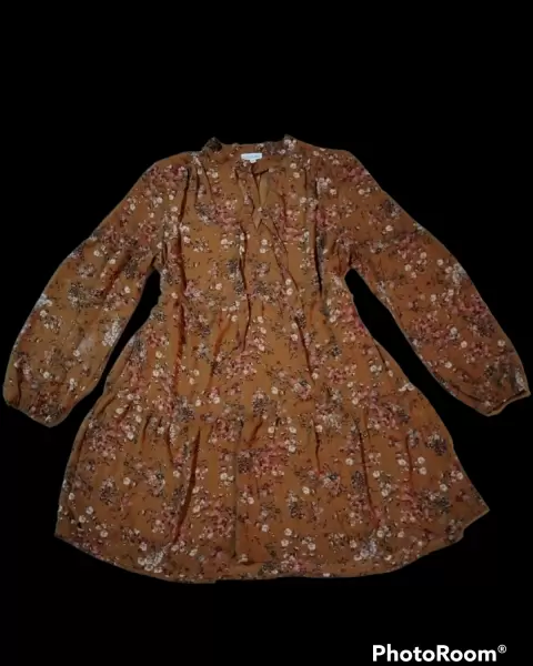 Hermoso vestido vaporoso de manga larga, es largo medio. La tela es de color café floreado con rosa, tiene unas cintas cerca del cuello para hacer un moño. Es un vestido muy fresco y femenino puedes usarlo con botines, tennis y zapatos