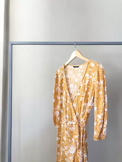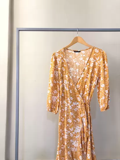 Vestido verano. Vestido color amarillo mostaza con estampado de flores blancas. Mangas 3/4, tela fresca y suelta. Vestido envolvente.