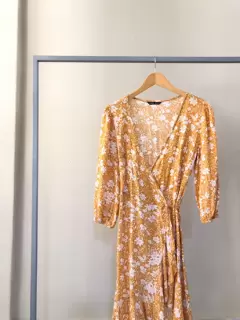 Vestido color amarillo mostaza con estampado de flores blancas. Mangas 3/4, tela fresca y suelta. Vestido envolvente.
