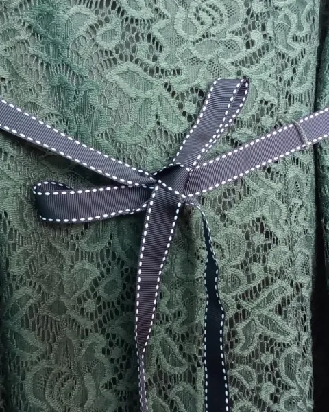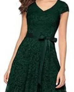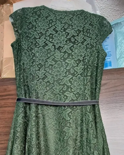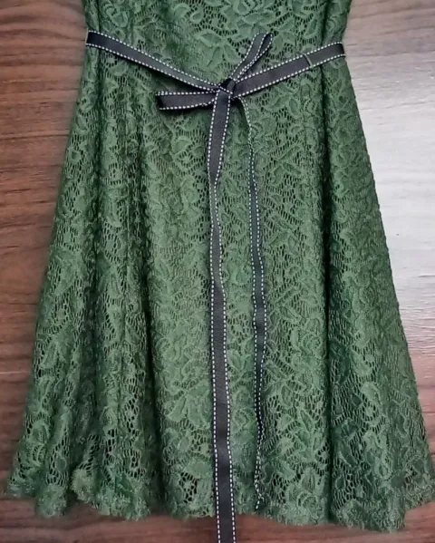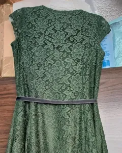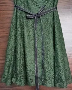 Vestido corto color verde de encaje con cinta a la citura ajustable, en buen estado.