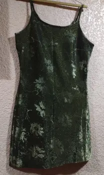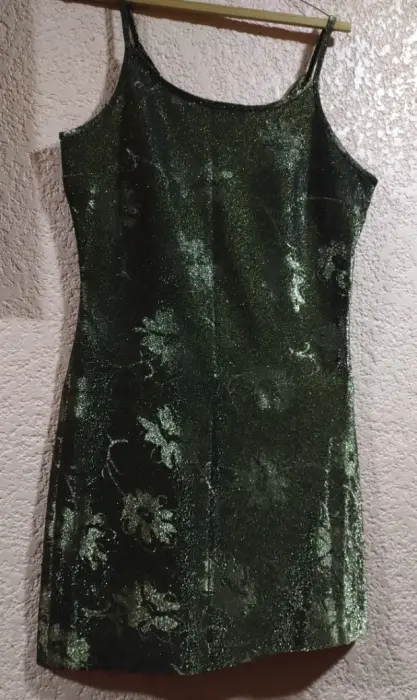 Vestido verde con dorado. Vestido color verde con dorado todo el vestido tiene brillos Pero no se te pega a la piel, tiene detalles de flores, cómodo, no tiene ningúna anomalía, precio a tratar.