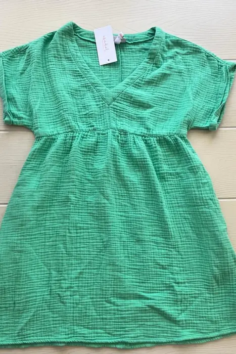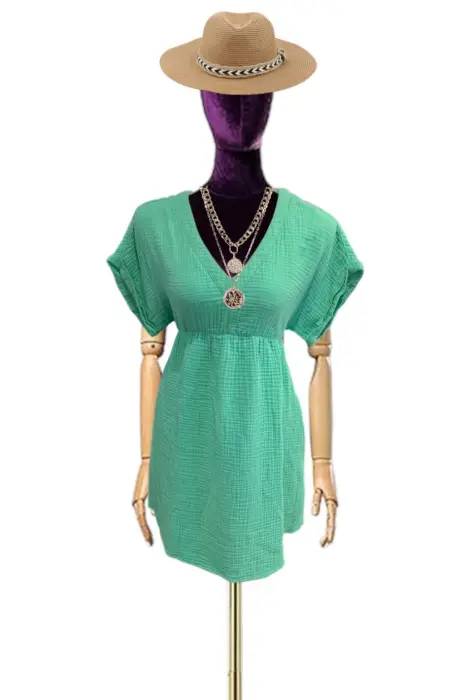Vestido verde corto es de meter sin cierre o broche, manga corta con corte debajo del pecho para acentuar la figura.Medidas:Axila a axila: 50 cmLargo: 100 cmlinea debajo del pecho: 98 cm