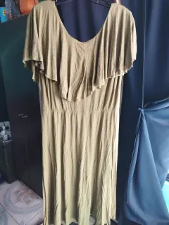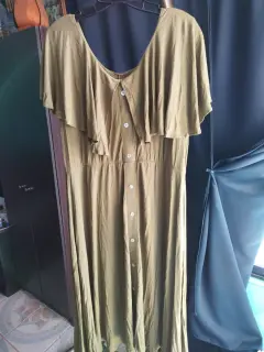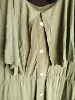 Vestido ligero de algodón, color verde olivo. Largo: debajo de la rodilla. Con aplique de holan en el cuello y aplique de boton enfrente