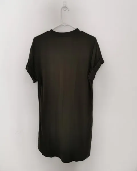 Vestido camisero tela suelta. Color verde olivo. Cuello mao, en V. Mangas cortas con valenciana. Muy amplio, línea A. Corte redondo. Talla S.