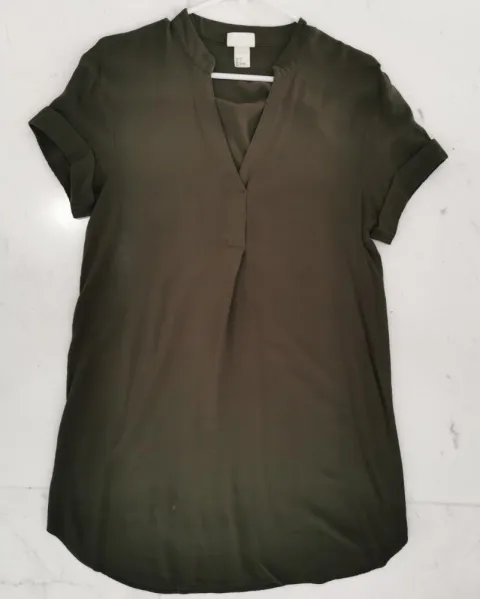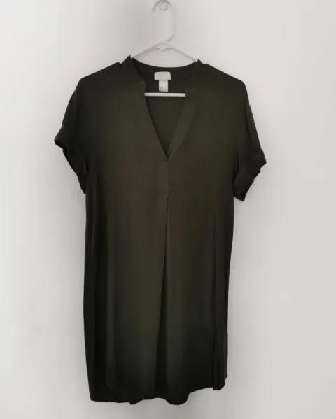 Vestido verde olivo H&M. Vestido camisero tela suelta. Color verde olivo. Cuello mao, en V. Mangas cortas con valenciana. Muy amplio, línea A. Corte redondo. Talla S.