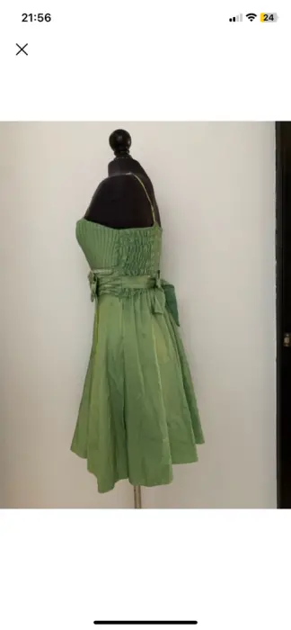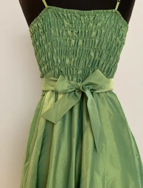 Bonito, ligero y cómodo vestido de fiesta talla ch de la marca Rocio Jesmar. Tiene bonitos detalles de pedrería en la cintura y un moñito bonito que puedes quitar si gustas ya que está sujeto con un segurito.Medidas de axila a axila 35 cm y estira hasta 45 cm, cintura 32 cm y estira hasta 36 cm.