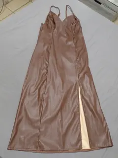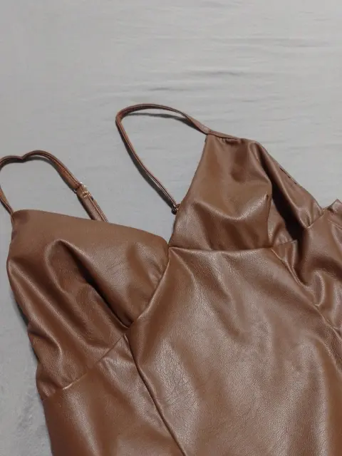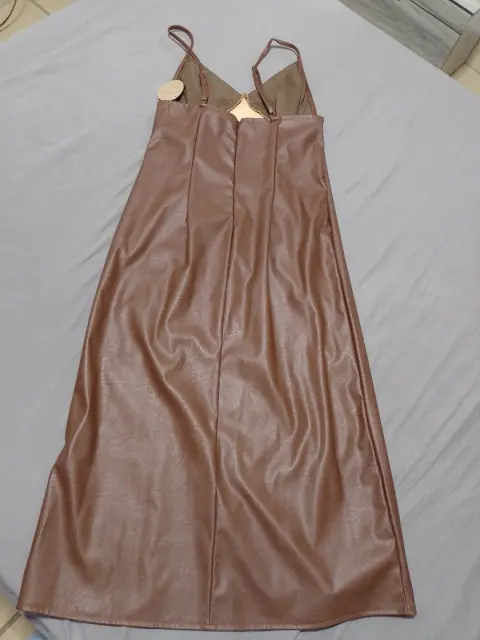 Vestido hasta la pantorrillaVinipiel caféNuevo con etiquetaTirantes ajustablesAbierta en pierna En perfecto estado